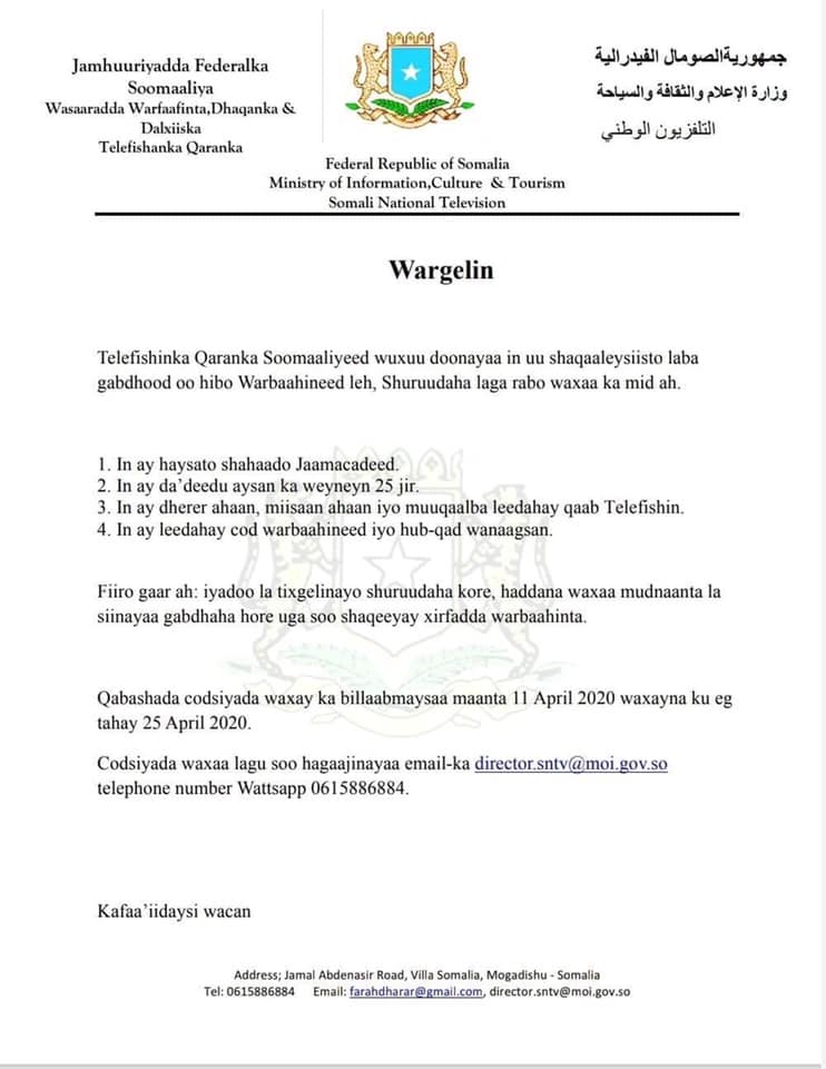 Warqaddan oo lagu xayeysiiyey shaqooyin ka banaan taleefishinka qaranka oo loo doonayo gabdho, ayaa lagu qoray shuruudo ay dad badan u arkeen takoor iyo aflagaado lagu sameeyey gabdhaha.