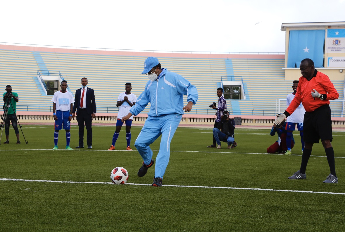 Madaxweynaha ayaa laaday kubadda dib loogu furayo Garoonka oo sanaddo kaddib martigeliyey Ciyaaraha Heerka Koowaad ee Soomaaliya, waxa uuna kulan dhexmaray kooxda Horseed ee Ciidamada Xoogga dalka iyo Kooxda Dowladda Hoose ee Muqdisho.