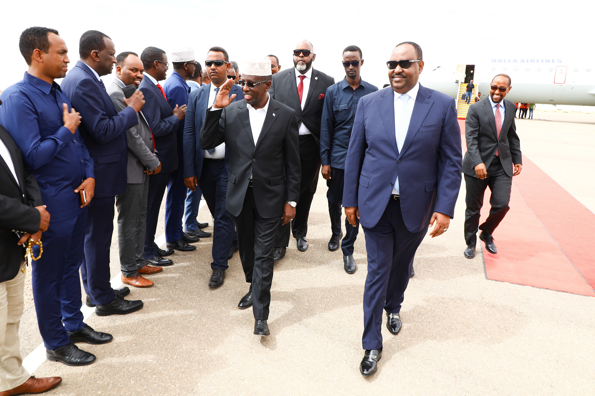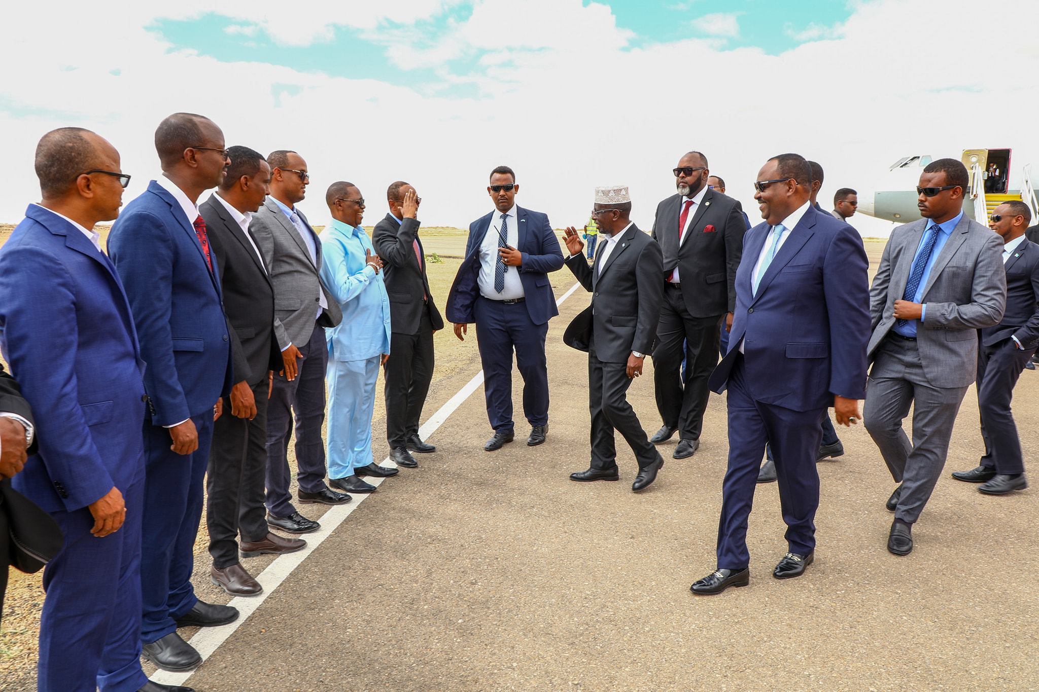 Sheekh Shariif iyo Wafdiga uu hoggaaminayo ayaa waxa si weyn ugu soo dhaweeyay garoonka magaalada Garoowe madaxweynaha Puntland, Saciid Deni iyo mas’uuliyiin ka tirsan maamulka Puntland.
