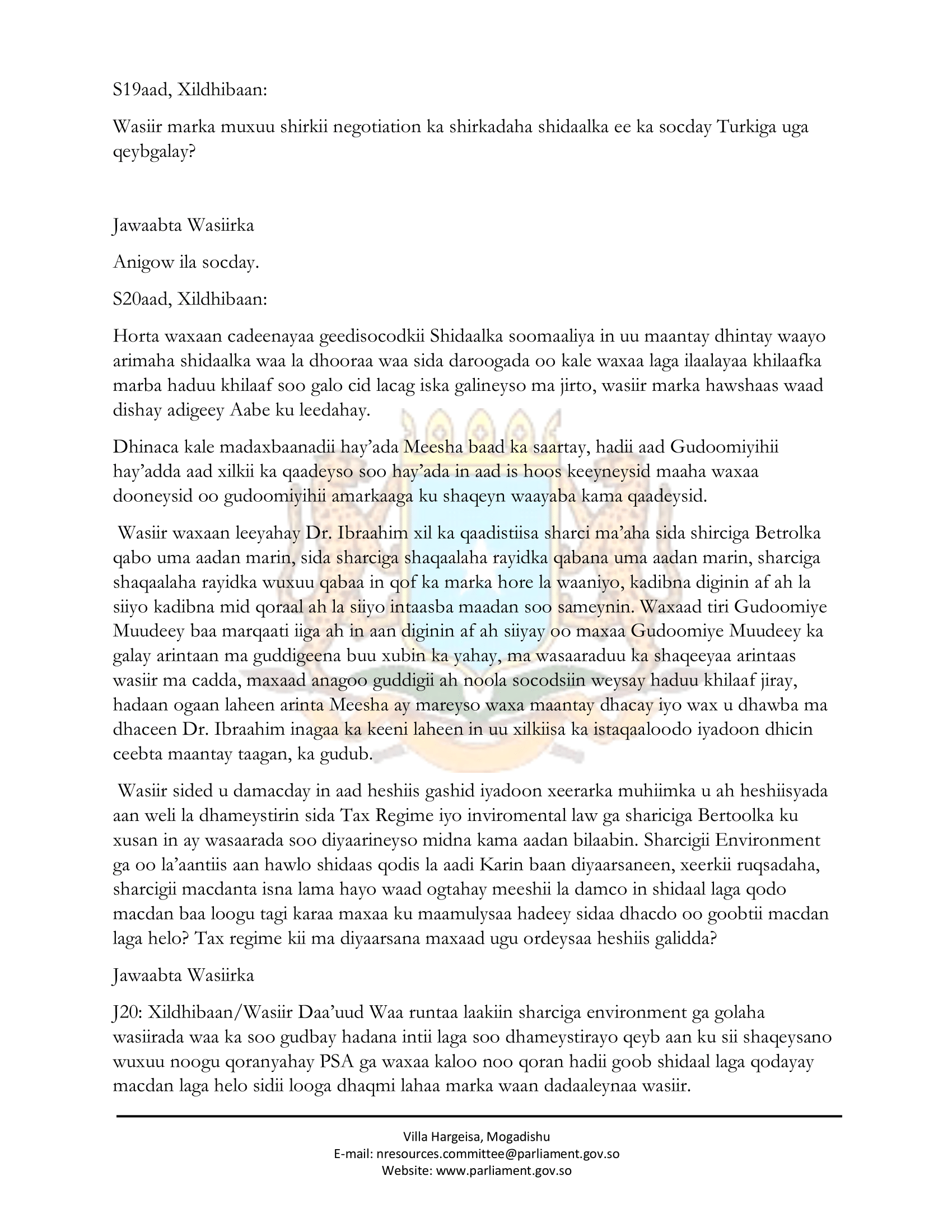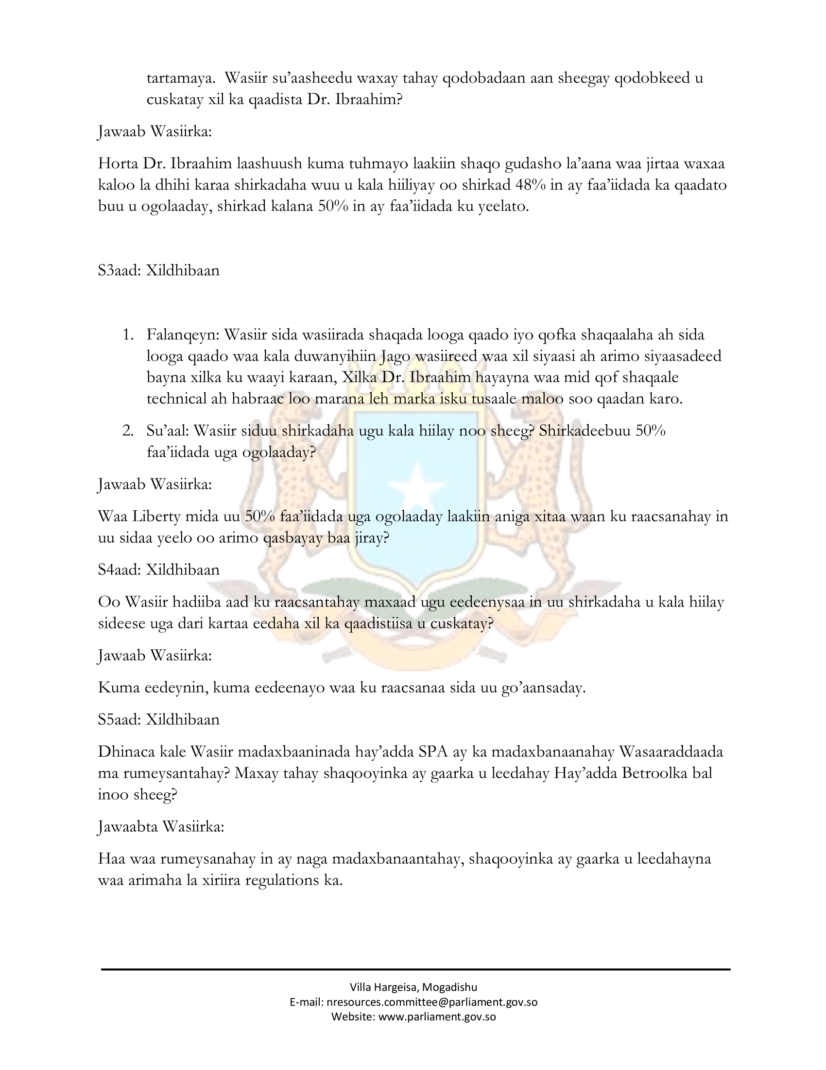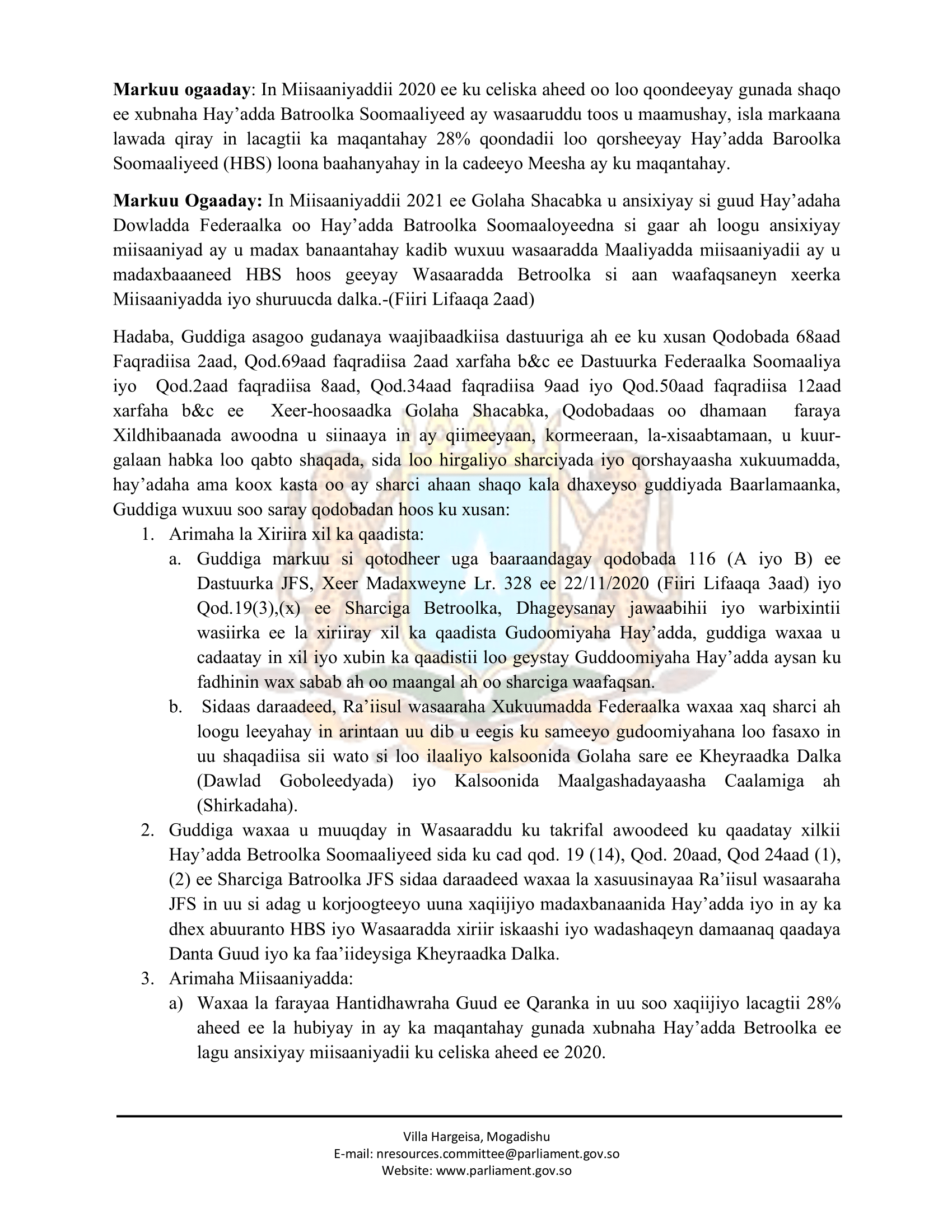 - Guddiga markuu si qotodheer uga baaraandagay qodobada 116 (A iyo B) ee Dastuurka JFS, Xeer Madaxweyne Lr. 328 ee 22/11/2020 (Fiiri Lifaaqa 3aad) iyo Qod.19(3),(x) ee Sharciga Betroolka, Dhageysanay jawaabihii iyo warbixintii wasiirka ee la xiriiray xil ka qaadista Gudoomiyaha Hay’adda, guddiga waxaa u cadaatay in xil iyo xubin ka qaadistii loo geystay Guddoomiyaha Hay’adda aysan ku fadhinin wax sabab ah oo maangal ah oo sharciga waafaqsan.