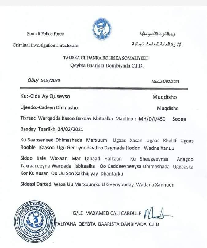 Dhakhaatiirta caafimaadka iyo laanta baarista dembiya ee booliska Soomaaliya ayaa geerida Ugaaska kadib bilaabay baaritaano, si loo ogaado sababta keentay dhimashada.