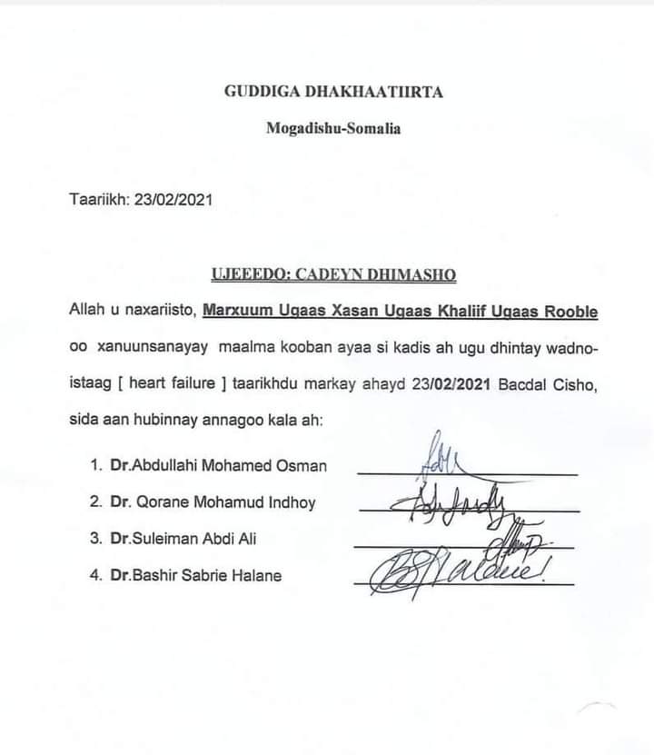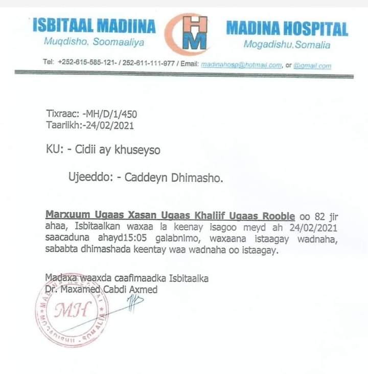 Muqdisho (Caasimada Online) – Qoraallo ay soo saareen isbitaalka Madiina iyo Taliska booliska Soomaaliya ayaa lagu shaaciyey sababta keentay dhimashada Allaha u naxariistee Ugaas Xasan Ugaas Khaliif Ugaas Rooble oo xalay ku geeriyooday magaalada Muqdisho.