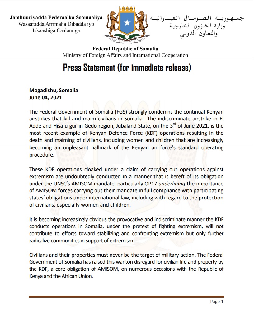 Muqdisho (Caasimada Online) –Wasaaradda arrimaha dibadda dowladda federaalka Soomaaliya ayaa soo saartay war-saxaafadeed ay si adag ugu cambaareyneyso duqeymo maalmihii lasoo dhaafay ay diyaaradaha dagaalka Kenya ka fuliyeen deegaano ka tirsan gobolka Gedo ee koonfurta Soomaaliya.