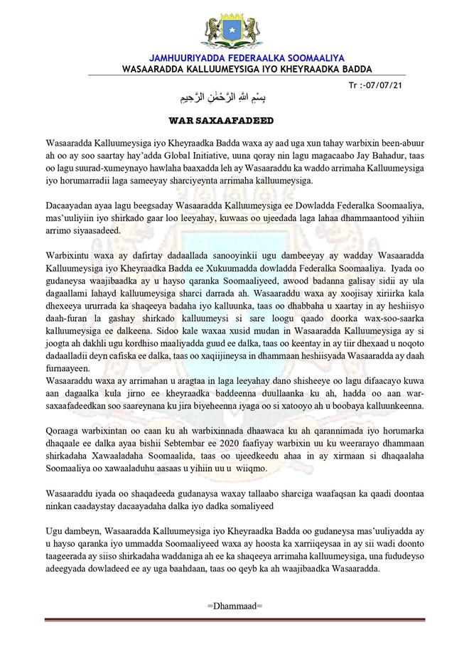 Warqad kasoo baxday wasaaradda kalluumeysiga xukuumadda Soomaaliya oo loogu jawaabayey Global Initiative ayaa lagu sheegay in warbixinta uu soo saaray ururkaasi ay tahay dacaayad lagu suura xumeynayo horrumarada laga sameeyey kalluumeysiga.