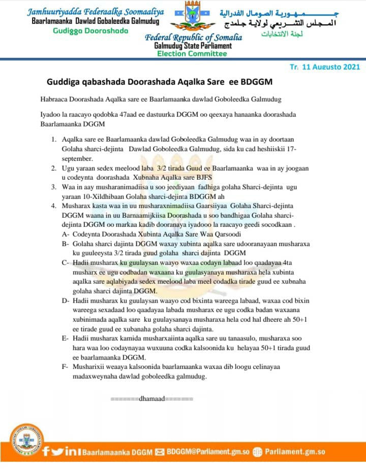 Halkaan hoose ka akhriso wareegtada kasoo baxday guddiga doorashada Baarlamaanka Galmudug