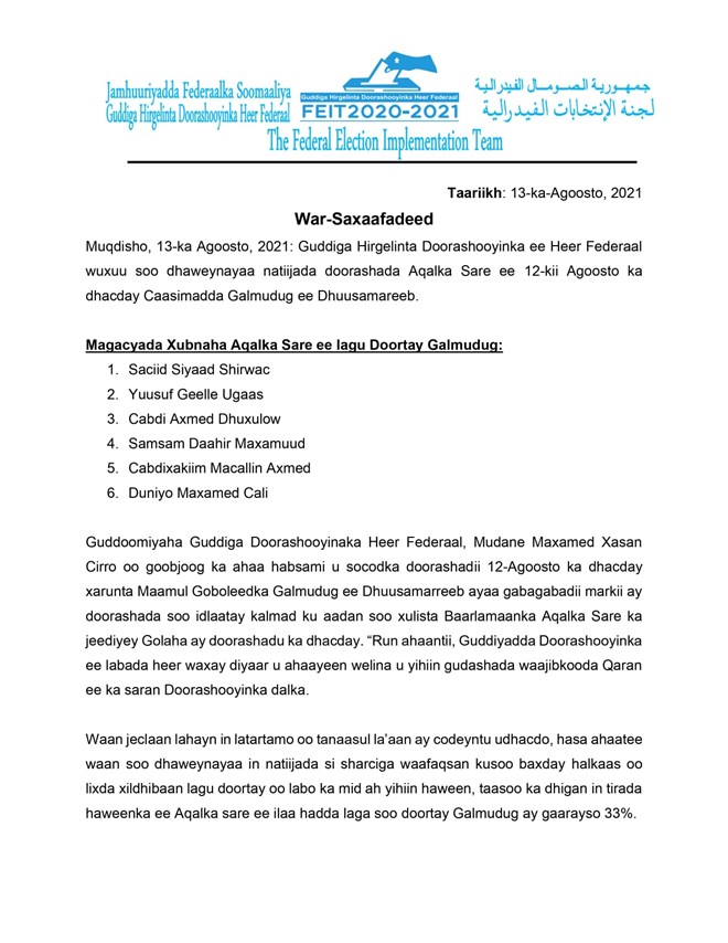 Dhinaca kale wuxuu tilmaamay inuu soo dhoweynayo natiijooyinka haatan ka soo baxay doorashooyinkii qabsoomay ee Golaha Aqalka Sare ee Soomaaliya.