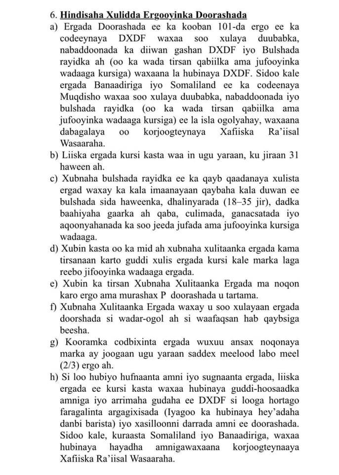 H) Si loo hubiyo hufnaanta amni iyo sugnaanta ergada, Iiiska ergada ee kursi kasta waxaa hubinaya guddi-hoosaadka amniga iyo arrimaha gudaha ee DXDF si looga hortago faragalinta argagixisada (Iyagoo ka hubinaya hey’adaha danbi barista) iyo xasilloonni darrada amni ee doorashada. Sidoo kale, kuraasta Somaliland iyo Banaadiriga, waxaa hubinaya hay’adaha amniga, waxaana korjoogteynaaya Xafiiska Ra’iisal Wasaaraha.