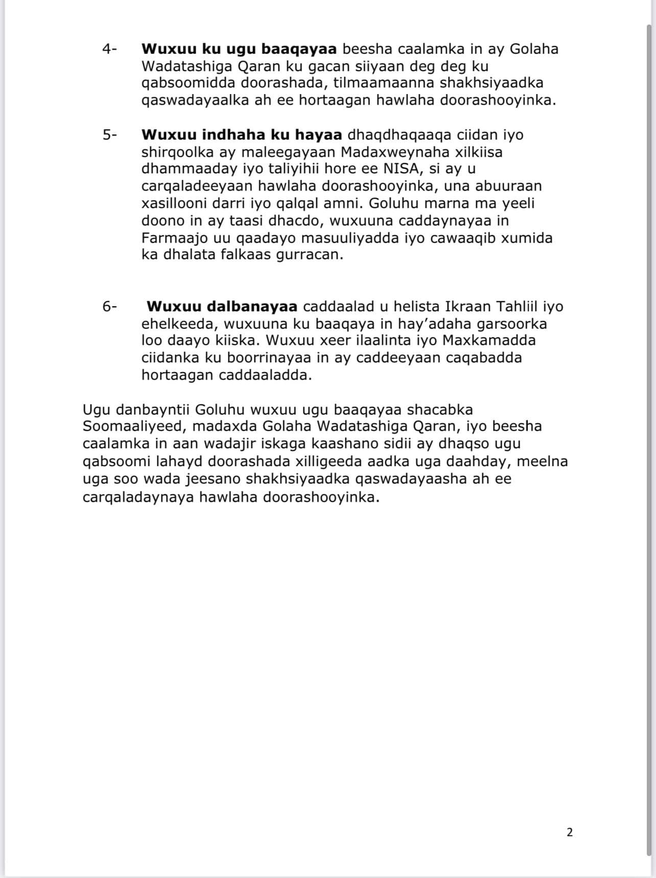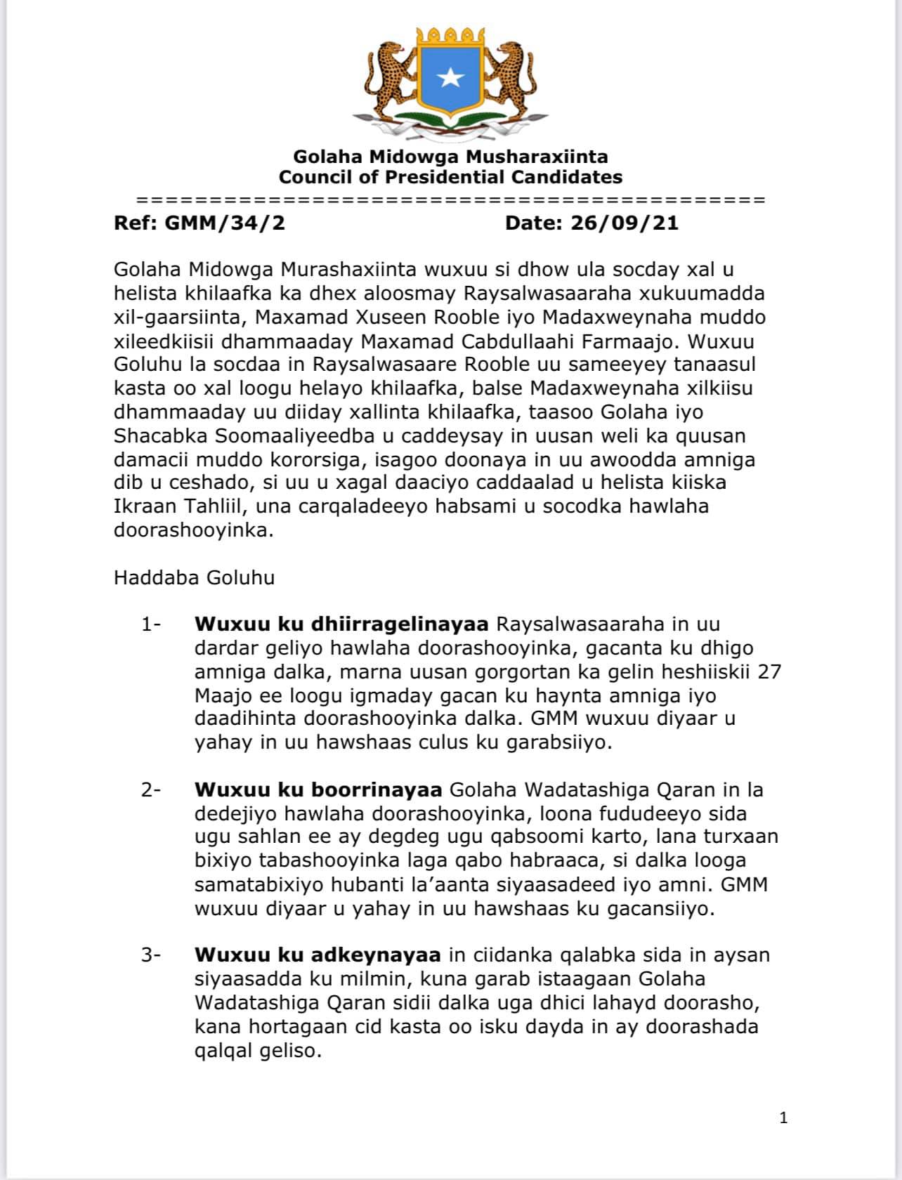 Golaha ayaa qoraalkan ku soo koobay lix qodob oo ay uga hadleen doorashooyinka dalka & khilaafka u dhexeeya madaxweynaha muddo xileedkiisu dhamaaday & Ra’iisul wasaaraha.
