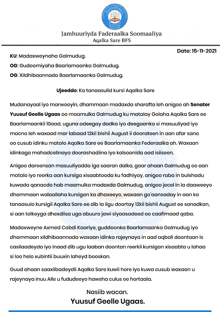 “Anigoo dareensan mas’uuliyadda iga saaran dalka, gaar ahaan Galmudug oo aan matalo iyo reerka aan kursiga xisaabtooda ku fadhiyay, anigoo raba in bulshadu kuwada qanacdo hab maamulka madaxda Galmudug, anigoo jecel in la daaweeyo dhammaan walaallaha kursigan ka dhaxeeyo, waxaan go’aansaday in aan ka tanaasulo kursigii Aqalka Sare ee dib la iigu doortay 12-kii bishii August ee sanadkan, si aan tolkeyga dhexdiisa uga abuuro jawi siyaasadeed oo caafimaad baba,” ayuu Senator dhagey ku yiri qoraalka uu isku casilay.