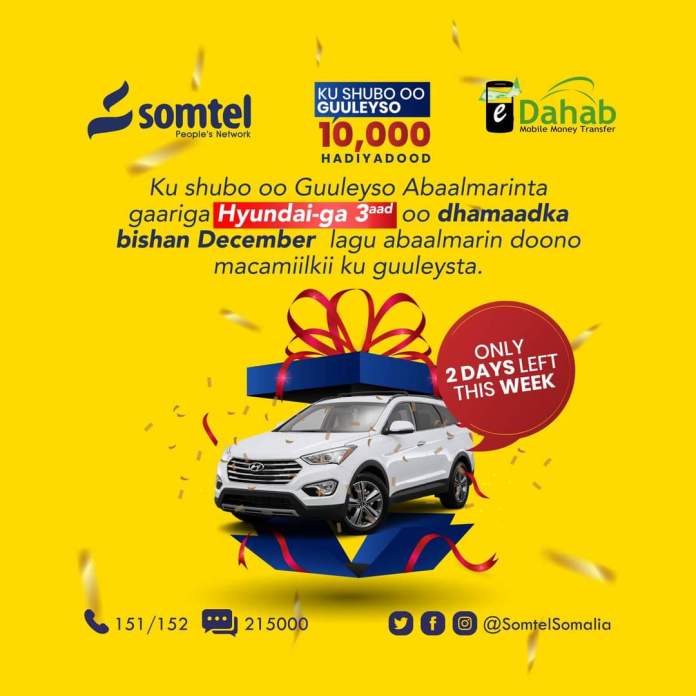 Isku soo wada duuboo Dhamaan macaamiisha Shirkadda Somtel waxaan u rajeynaynaa inay ku guuleystaan 10,000 hadiyadood , Shirkaddu ugu talagalnay Macamiisheeda sharafta leh hadiyadahaan oo Ugu sareeyo gaari Hyundai-ga kaasoo Todobaadkan 31 bisha December aan si rasmi ah ugu dhawaaqi doono macaamiilkii ku guuleystay gaarigii lsedexaad waxaan leenahay macaamiisheena ka faa’ideysta Ololaha ku shubo oo guuleyso 10’000 hadiyadood macaamiil Waad u u tartami kartaan ilaa Daqiiqada ugu dambeeysa Maalinta jimcaha 31/12/2021abaaraha 05:30pm (Galabnimo) fadlan samee ku shubashasho karaka hadalka ama data internt adigoo uga shuban kara adeegga eDahab *101# ama ku shubo scratch card-ka la xoqdodo,ugu dambeyntii waxaad uga shuban kartaa adeegga eDahab Reseller