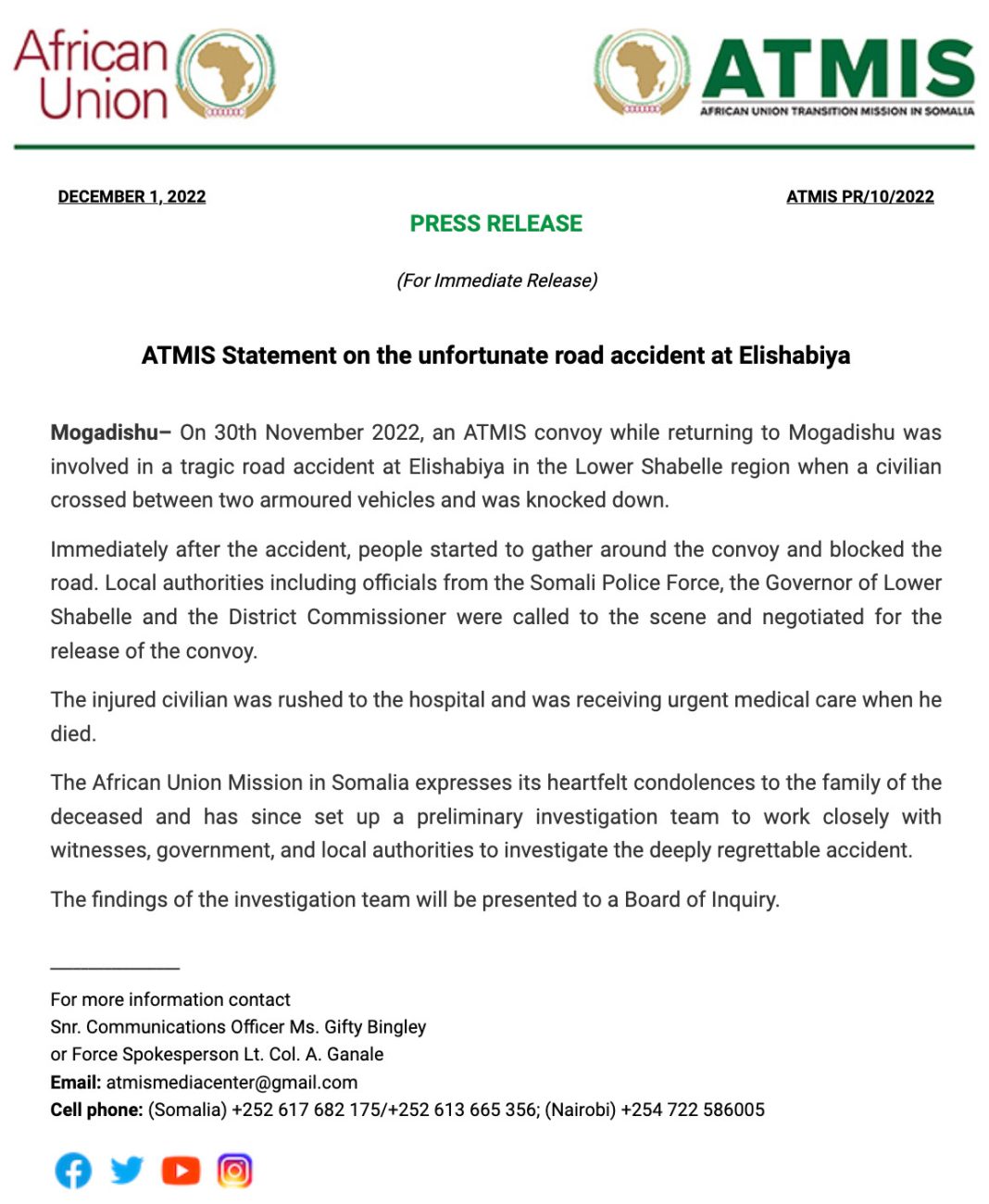 Qoraal kasoo baxay ATMIS ayaa waxa ay ku xaqiijisay jiritaanka dhacdadan waxayna sheegtay in wiilka dhalinyarada ahee geeriyooday uu dhex maray labo gaari oo nuuca gaashaaman ah kadibna ay jiireen, xilli ay ku socdeen si xowli ah.
